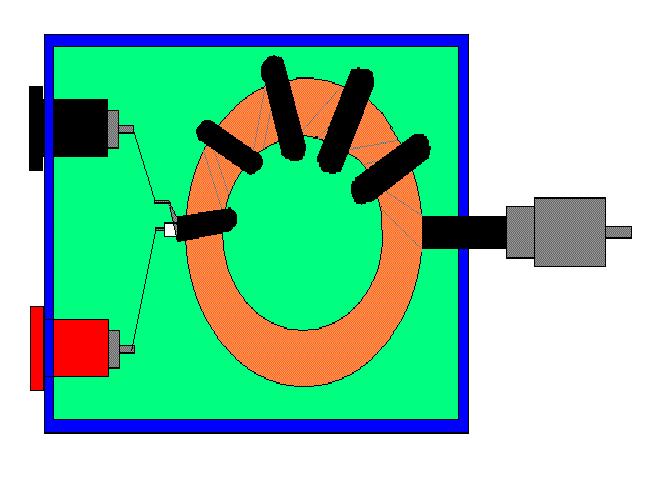 Aan de symmetrische kant van de kern moet de coaxkabel meteen gesplitst worden en naar de aansluitbussen gaan. ( 4mm banaansteker chassis delen ).