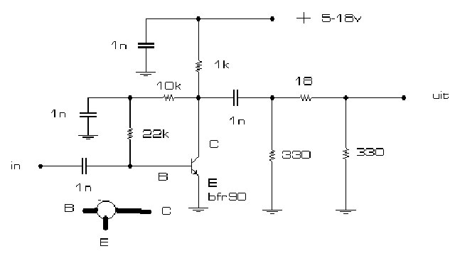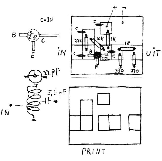 zijn diensten bewezen. Door het breedbandig ontwerp was deze versterker in een vlinderdipool antenne geplaatst , uitermate geschikt om kabeltelevisie door de muur te ontvangen ,wat een besparing van wel 10 euro per maand opleverde. De schakeling bestaat uit 1 tor en 6 weerstanden , 4 condensatoren en een stukje printplaat van 2,5 bij 5 cm. Met een zaag of vijl wordt het printje van eilandjes voorzien en volgens schema gesoldeerd., de schakeling neemt genoegen met een voedingsspanning van 5 tot 18 volt. |